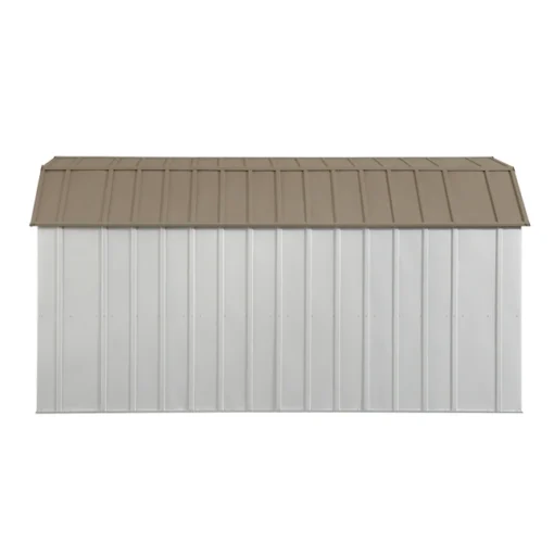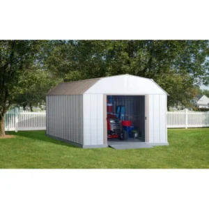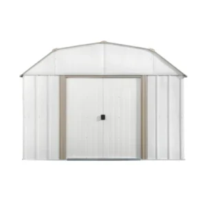 The shed has a has a baked-on enamel finish in eggshell and taupe to complement home exteriors.