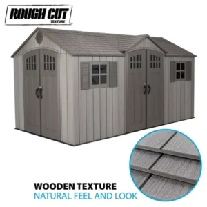 Store lawnmowers, sports equipment, and gardening tools in the Lifetime Rough-Cut Dual-Entry Outdoor Storage Shed. Generous dimensions provide 109 sq. ft. of floor space for storing bicycles and other large items. The slip-resistant polyethylene floor stands up to oil, solvents, and accidental impacts. Integrated shelving and wall hooks provide extra storage space, which is ideal for tools, gardening supplies, and other small items. Use the shed as storage or as a small workspace for your home projects.