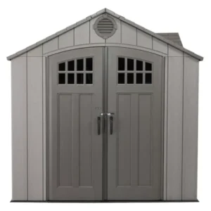 The sturdy powder-coated steel and high-density polyethylene construction let this Lifetime rough-cut dual-entry outdoor storage shed hold up against harsh weather conditions. The weather-resistant construction keeps stored belongings dry during storms, resists sun exposure without cracking or fading, and stands up to winds up to 65mph.